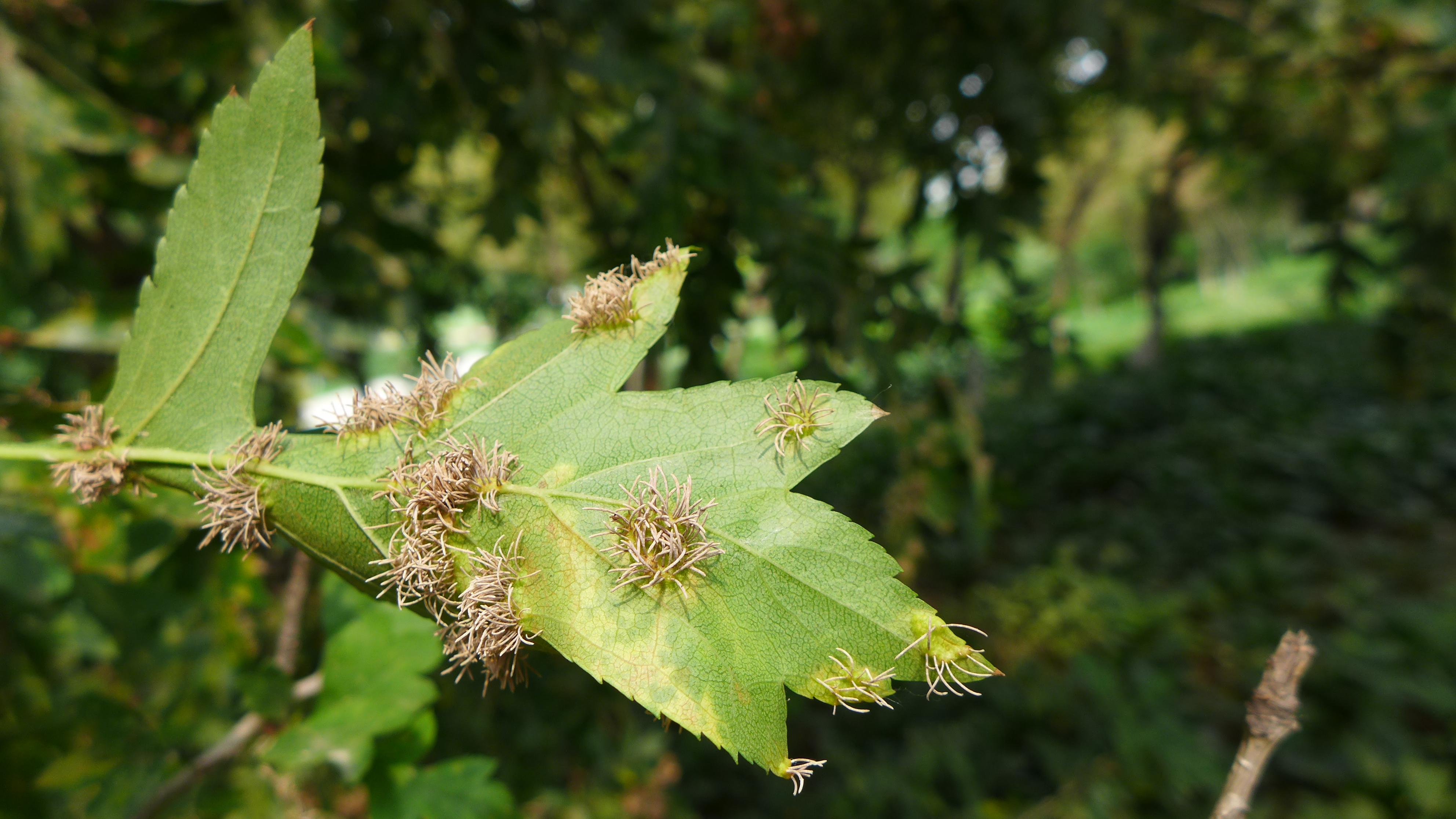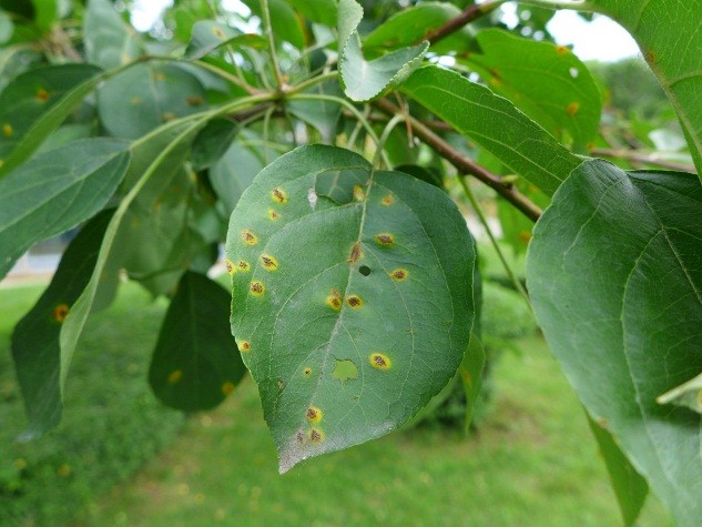 苹桧锈病,又名赤星病,是由山田胶锈菌侵染所引起的病害,在我市主要为害苹果、梨、海棠、山楂等植物的叶片,也能为害嫩枝、幼果和果柄,同时为害转主寄主桧柏造成早期落叶。植物叶片受到侵害通常先在叶片表面形成黄绿色小斑,逐渐扩大橙黄色圆斑。随后叶背面形成白色隆起,上面产生许多黄色毛状物(如下图)。