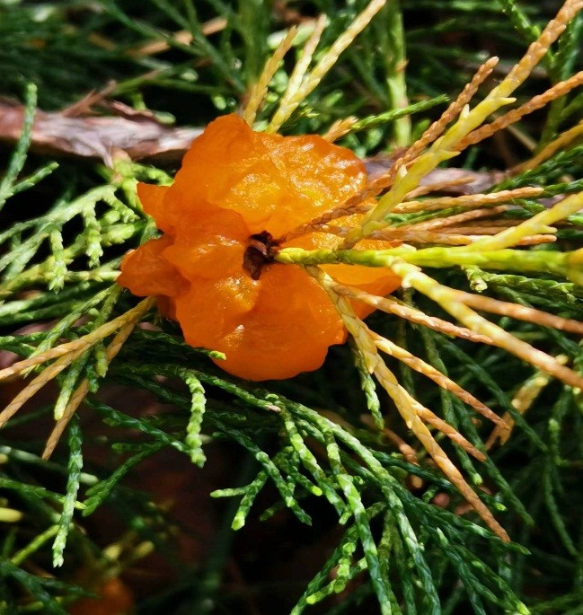 苹桧锈病的病原菌是典型的转主寄生菌,病菌以菌丝体在桧柏染病组织内越冬。4月间逐渐形成锈褐色的角状突起,遇雨后吸水膨胀,形成橙黄色、胶质的鸡冠状冬孢子角,犹如柏树“开花”。冬孢子萌发后产生担子和担孢子,并借助气流传播到阔叶寄主进行侵染。8、9月份锈孢子成熟再由气流传回桧柏上侵染、越冬。该病害的流行与早春的气候密切相关,降雨频繁,气温较高易诱发此病流行。相反,虽降雨偏多,气温较低则发病较轻。