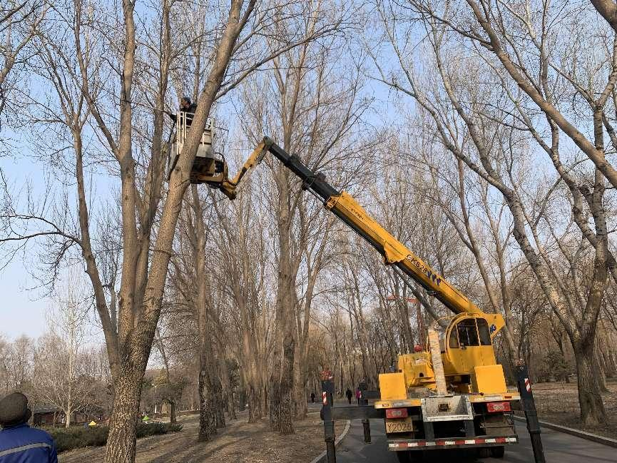 首先,对园区内存在安全隐患的枝条、病虫枝、枯死枝、生长不合理枝条进行剪除,增强树势,提高观赏效果;其次,对公园环路两侧的高大乔木采用高空作业车进行修剪,现已修剪200余株。修剪下的大量树木枝条并没有被废弃,而是采用园林植物资源循环利用的新方式,由工作人员收集起来,通过机器制作成细碎的生态树屑。部分用于裸露地面治理,起到防止扬尘的作用;部分铺于林下,作为天然的树木肥料。